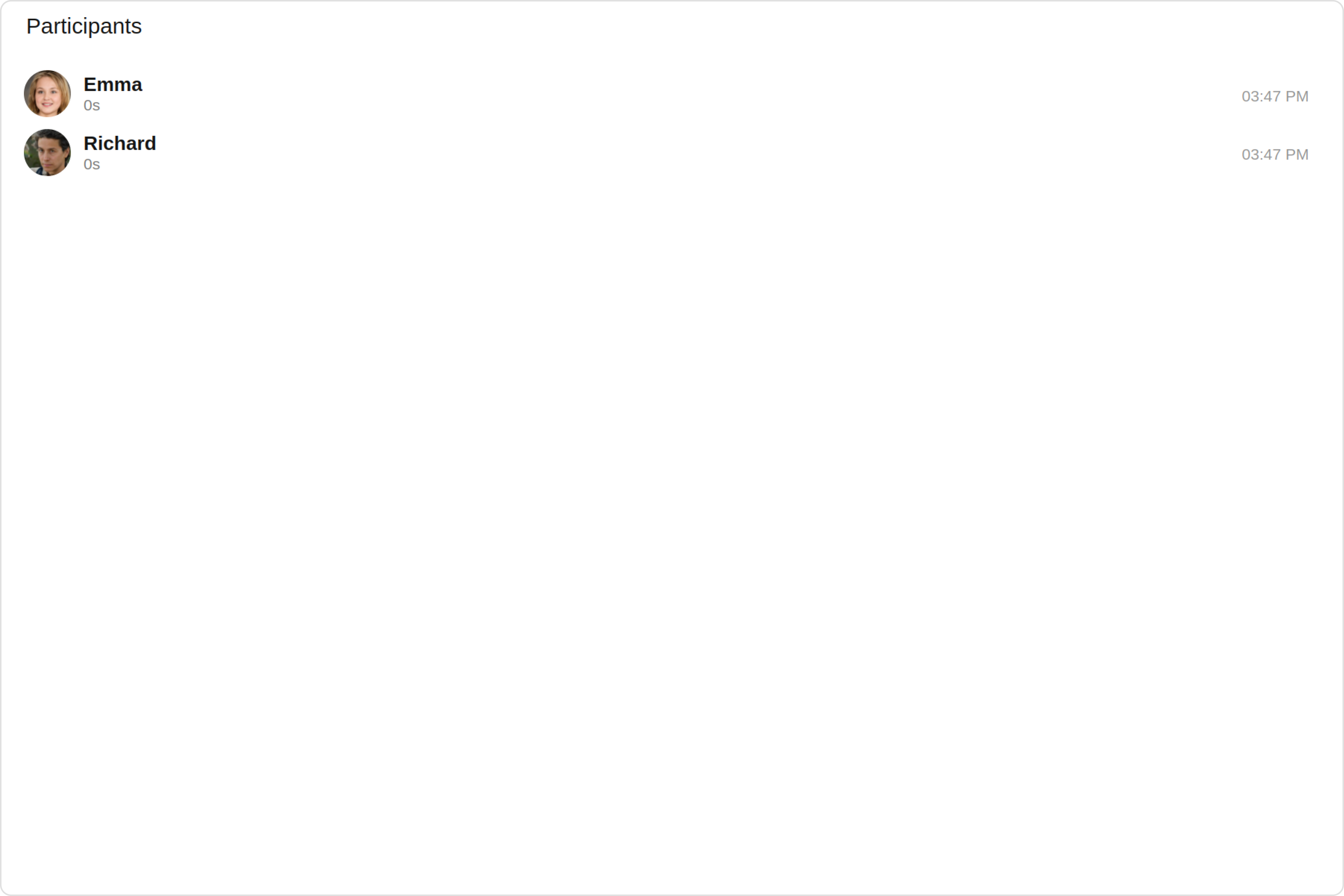 To customize the appearance, you can assign aCallLogParticipantsStyle object to the Call Log Participants component.