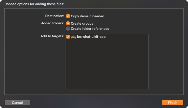 iii. Make sure you’ve selected ✅ Copy items if needed as well as 🔘 Create group options while adding a `Library inside your project. iv. If the Library is added successfully, all added folders will be in Yellow color.