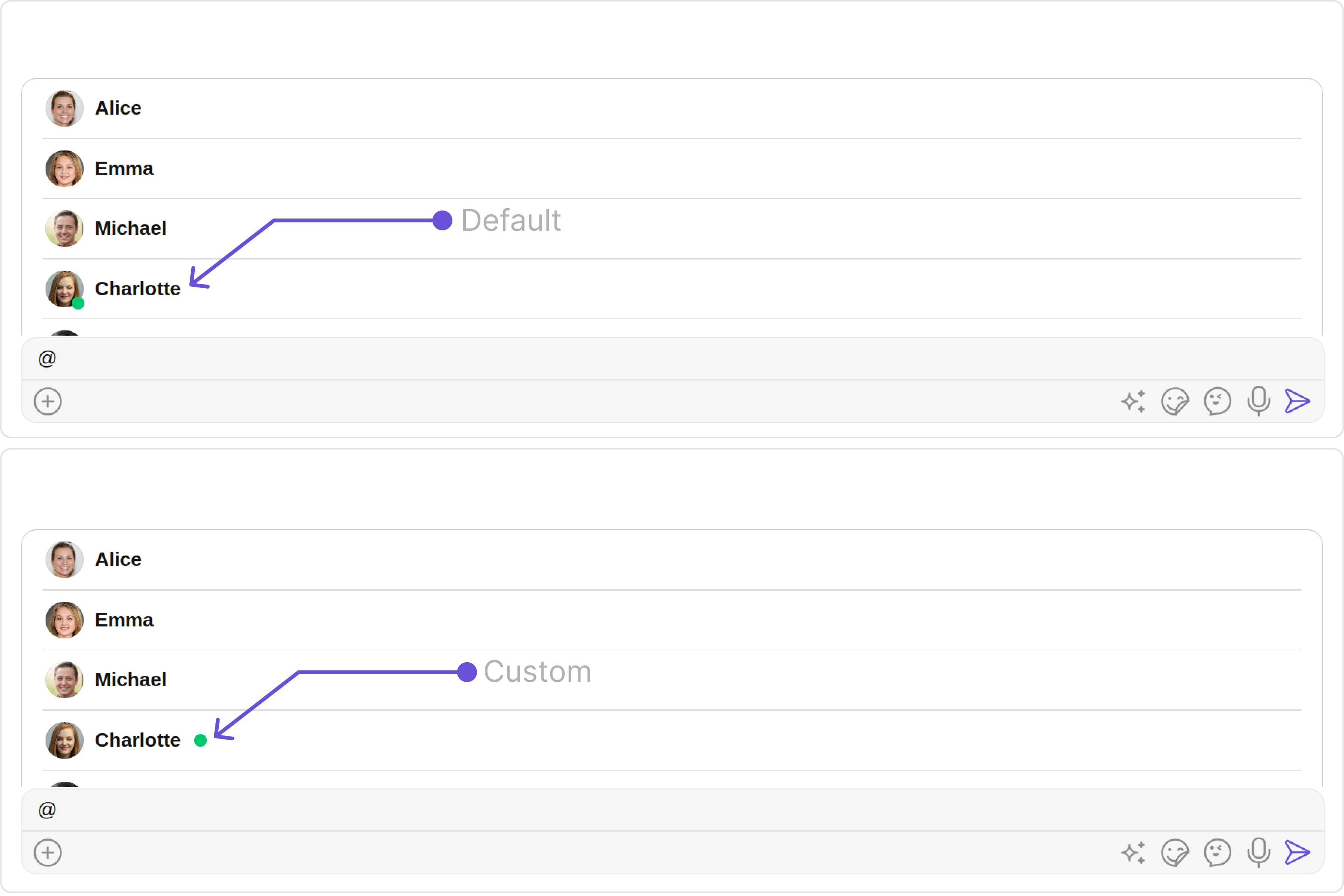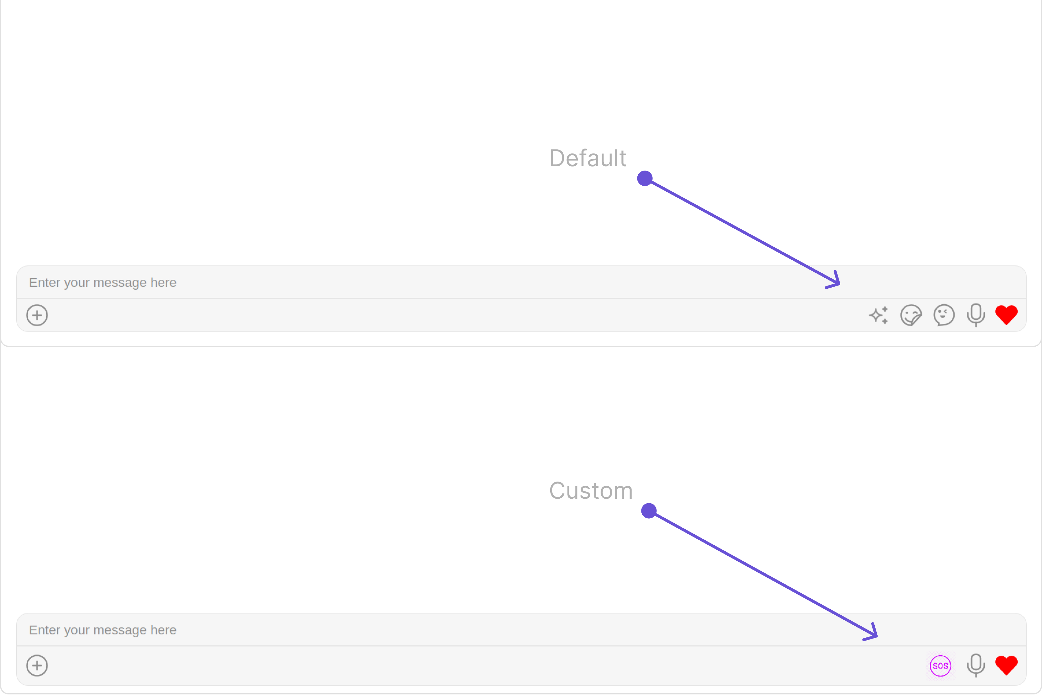 These are a set of small functional customizations that allow you to fine-tune the overall experience of the component. With these, you can change text, set custom icons, and toggle the visibility of UI elements.- MessageComposerDemo.tsx
